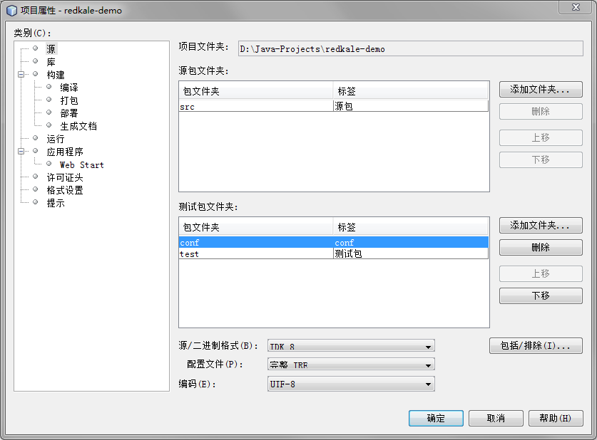 点击“源”,在下面测试包中导入项目目录下的conf目录,这样方便编辑conf下的配置文件(在上面src中导入会打包进jar中)。