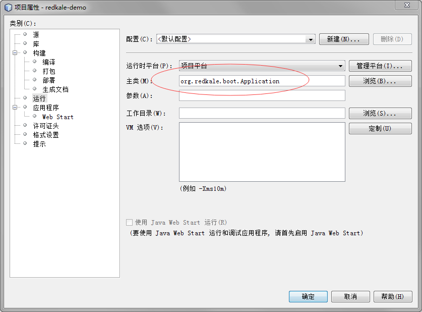 点击“运行”,在主类中输入 "org.redkale.boot.Application",然后点击“确定”。